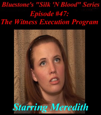 Meredith is a witness who is enrolled in the Witness Protection Program, but it might as well be called the 'Witness Execution Program', since one of the F.B.I. agents involved has sold the details of her new identity to the highest bidder. Meredith is made to pay for testifying against the mob... BIG TIME!!! 25 bullets impact her jiggling body.