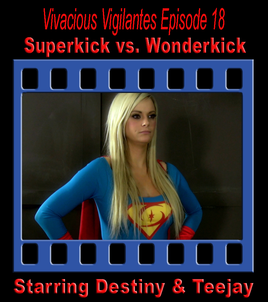 Wonderkick has been captured by a Gatekeeper of the Seventh Sanctum, but when she awakens another sidekick, Superkick, accuses her of abducting Wondra. Despite her denials, Superkick attacks her, and the two beauties engage in a wild fistfight! Then, the Gatekeeper returns and takes on both girls, knocking them out, stripping them topless, choking them, then stabbing them both in the chest! Lots of action in this one.
