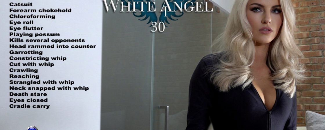 Jenny’s first appearance as a White Angel Agent starts with action and continues as she takes out a half dozen Remo agents while barely breaking a sweat; although, she is strangled, choked and chloroformed in the process. Then, she comes up against Agent X. He uses a constricting whip to draw blood, inflict pain, and wind around her lovely neck to strangle her. Jenny has finally met her match as she writhes helplessly until he pushes the fatal stud to viciously snap her neck!